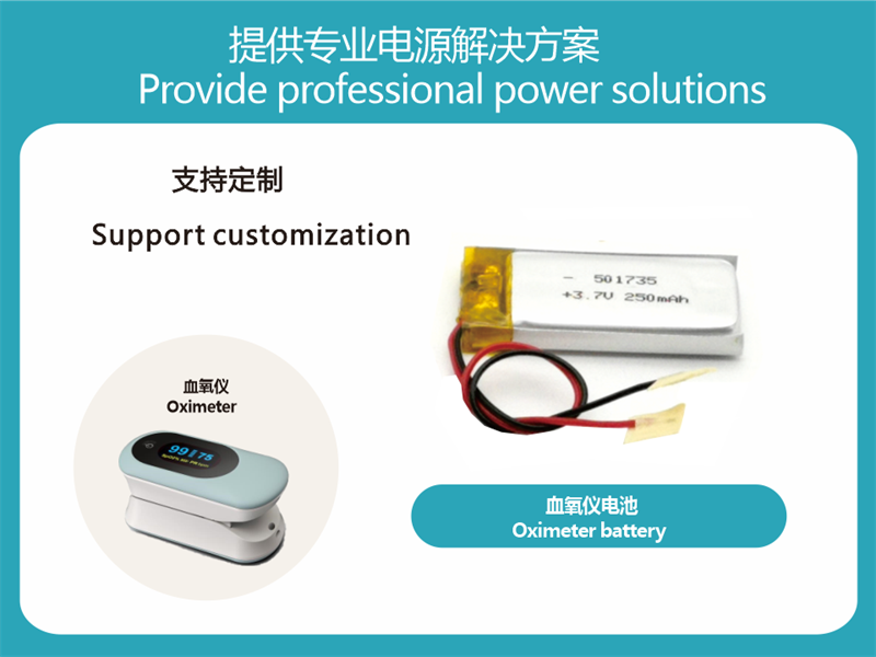 Xuanli is customized for wireless oximeter and uses high-performance polymer battery to supply power to meet the continuous, efficient and stable operation of the product.